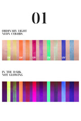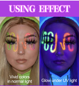 Experience the ultimate in glow with our water-soluble fluorescent UV face paint and eyeshadow palette. These eco-friendly, non-toxic, and odorless products offer vivid colors in regular light and an enchanting UV glow. Perfect for club events, carnivals, Halloween, dance schools, concerts, and stage shows, they'll help you shine under ultraviolet lighting.