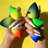 These gradient sponge designed with a unique style, inspired by the Tail of a Mermaid. It has a soft and smooth texture that gently glides across the skin, and it seamlessly blends pressed, loose, or liquid foundation as well as concealer, bronzer, and blush.
